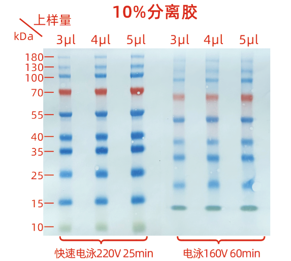本產(chǎn)品由10-180 kDa的10種純化的天然蛋白混合而成,其中70 kDa為橙紅色蛋白條帶,10 kDa為綠色蛋白條,方便判斷各個條帶的準(zhǔn)確位置。產(chǎn)品適合作為SDS-PAGE電泳時變性蛋白樣品的分子量參照,并可實(shí)時觀察蛋白樣品的電泳分離狀況,也可用于檢測Western blot的轉(zhuǎn)膜效率。由于共價結(jié)合的染料會影響蛋白質(zhì)分子的電泳遷移率,本產(chǎn)品僅適于粗略地估計(jì)目的蛋白樣品的分子量。