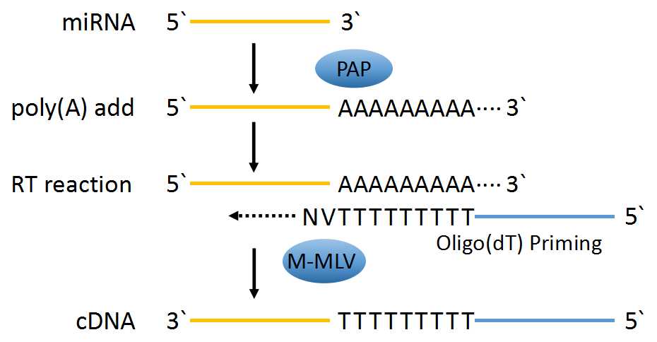 本產(chǎn)品以總RNA或miRNA為模板,先通過Poly(A)聚合酶在miRNA的3`端加多聚A尾,隨后使用Universal Oligo(dT) Primer進(jìn)行逆轉(zhuǎn)錄反應(yīng),最終生成miRNA對應(yīng)的cDNA第一鏈。