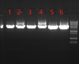 挑取單斑下提取質(zhì)粒圖:1-6分別為7h的DH5α,7h的K1,8h的DH5α,8h的K1,過夜的含氨芐抗性質(zhì)粒的DH5α,K1。