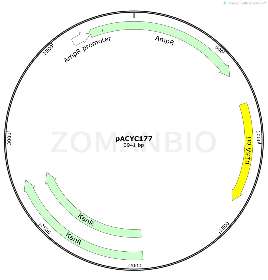 pACYC177 is an E. coli plasmid cloning vector containing the p15A origin of replication (1-4). This allows pACYC177 to coexist in cells with plasmids of the ColE1 compatibility group (e.g., pBR322, pUC19). It is a low copy number vector, at about 15 copies per cell (5), but can be amplified with chloramphenicol or spectinomycin.