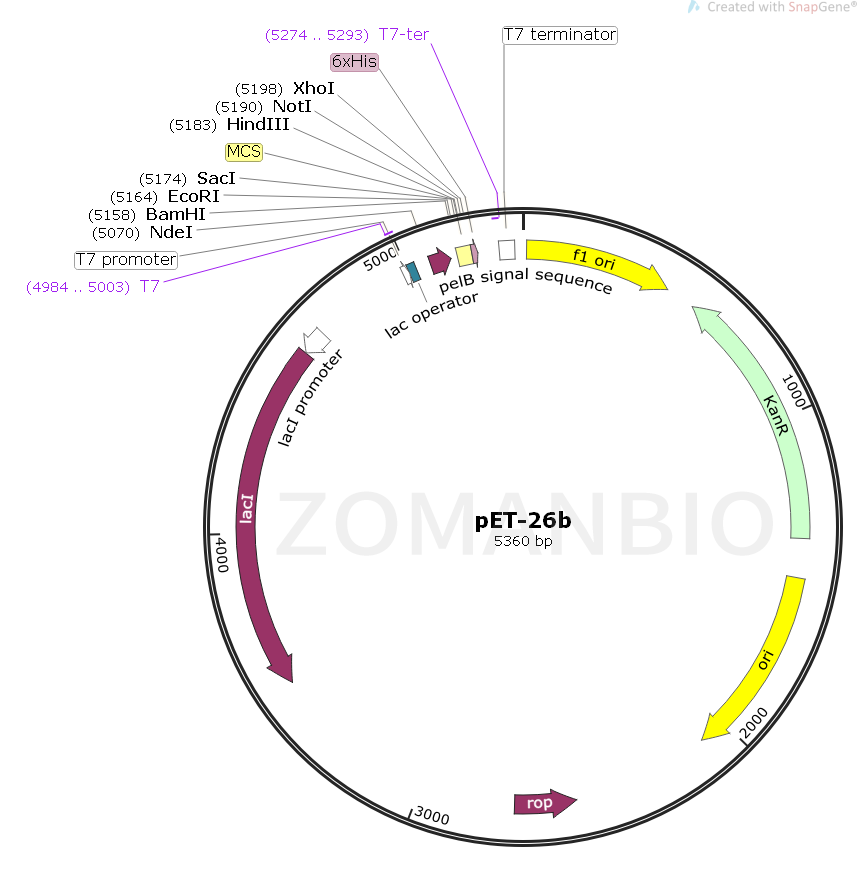 pET-26b質(zhì)粒是一種原核表達載體,C端含有一個6×His標簽,N端含有一個pelB前導肽。該質(zhì)粒含有多個常用的酶切位點,便于不同基因克隆。表達由宿主細胞提供的T7 RNA聚合酶誘導,目的基因被克隆到質(zhì)粒載體上,受噬菌體強轉(zhuǎn)錄及翻譯信號控制。
