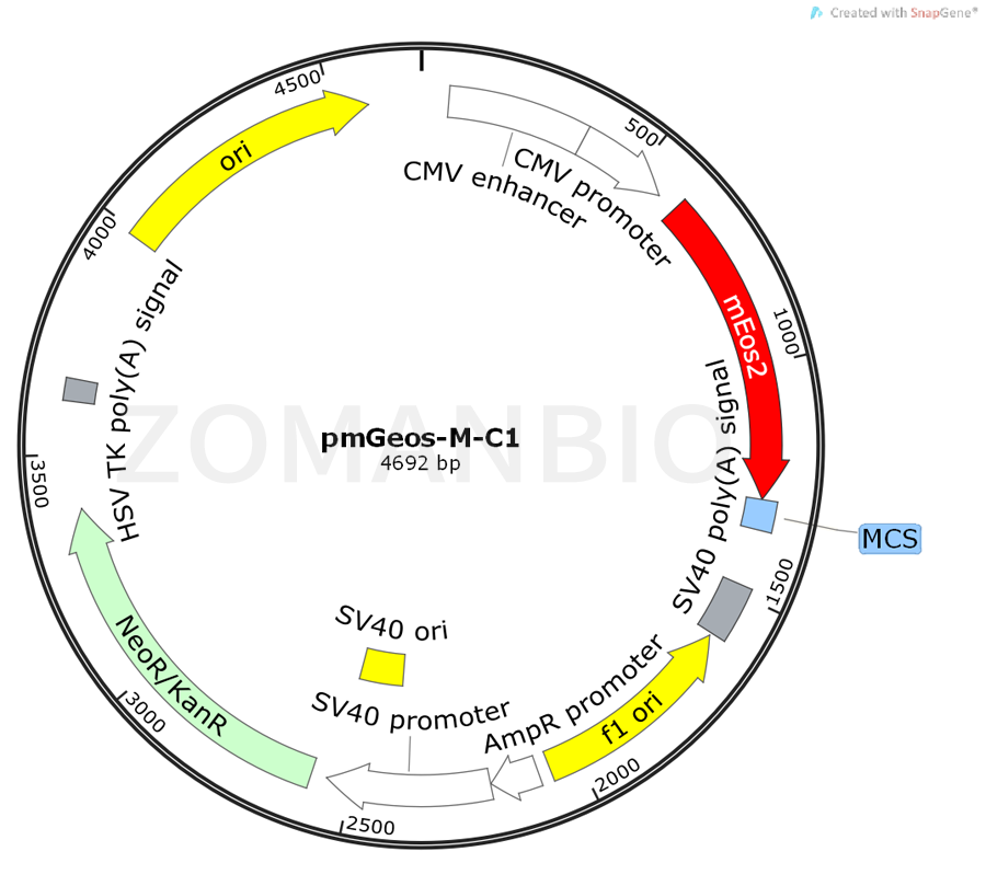 PmGeos-M-C1 is the evolution of the pEGFP-C1 from the plasmid, it is the carrier of the size of mEos3.2, 4692bp this tag is a combination of mEos2 and I102N/H158E/Y189A from me.