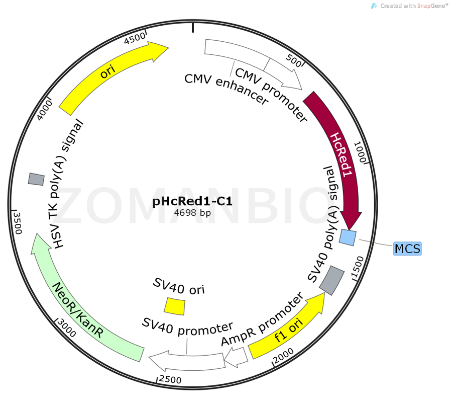 pHcRed1-C1 is a mammalian expression vector designed to express a protein of interest fused to the C-terminus of the far-red fluorescent protein HcRed1. pHcRed1-C1 can be used to monitor gene expression and protein localization in vivo or as a cotransfection marker; the unmodified vector will express HcRed1 in mammalian cells. HcRed1 was generated by mutagenesis of a non-fluorescent chromoprotein from the reef coral Heteractis crispa . The coding sequence for HcRed1 is human codon-optimized for higher expression in mammalian cells . Genes cloned into the multiple cloning site (MCS) downstream of the HcRed1 coding sequence are expressed as fusions to the C-terminus of HcRed1. The MCS in pHcRed1-C1 is positioned between the HcRed1 coding sequence and the SV40 polyadenylation signal (SV40 poly A). Genes cloned into the MCS will be expressed as fusions to the C-terminus of HcRed1 if they are in the same reading frame as HcRed1 and there are no intervening stop codons. A Kozak consensus sequence upstream of HcRed1 increases the translation efficiency in eukaryotic cells . SV40 poly A signals downstream of the MCS direct proper processing of the 3' end of mRNA transcripts. The vector also contains an SV40 origin for replication in mammalian cells expressing the SV40 T-antigen, a pUC origin of replication for propagation in E. coli, and an f1 origin for single-stranded DNA production. A neomycin resistance cassette (Neor)—consisting of the SV40 early promoter, the neomycin/kanamycin resistance gene of Tn5, and polyadenylation signals from the Herpes simplex virus thymidine kinase (HSV TK) gene—allows stably transfected eukaryotic cells to be selected using G418. A bacterial promoter upstream of this cassette expresses kanamycin resistance in E. coli. pHcRed1-C1 can be transfected into mammalian cells using any standard transfection method. If required, stable transformants can be selected using G418 .