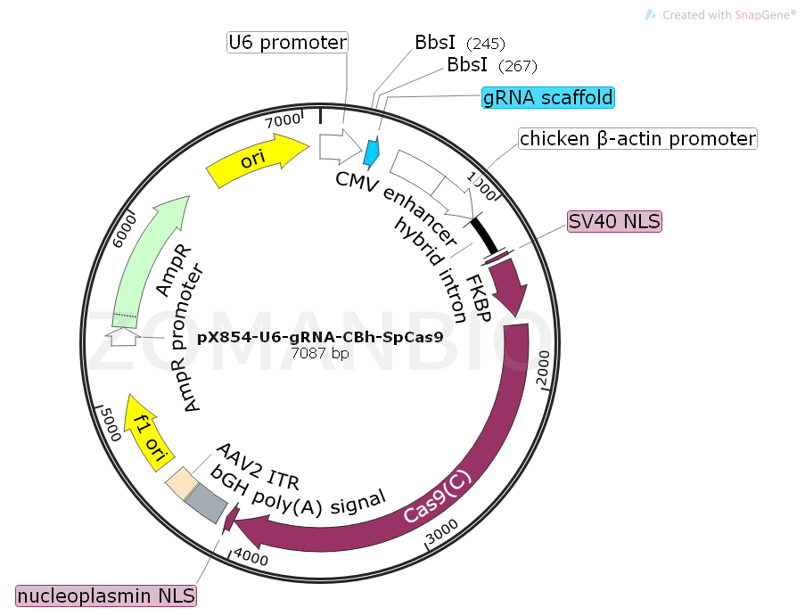 質(zhì)粒序列請下載:ZK673pX854-U6-gRNA-CBh-SpCas9哺乳編輯質(zhì)粒.txt