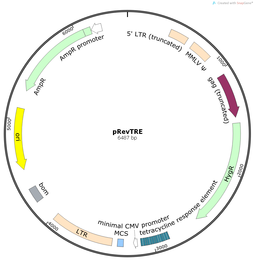 pRevTRE is a retroviral Tet response vector that expresses a gene of interest from the Tetresponse element (TRE). This vector is derived from pLNCX, a retroviral vector created using elements of Moloney murine leukemia virus (MoMuLV) and Moloney murine sarcoma virus (MoMuSV) as described (1). The TRE contains seven direct repeats of the tetO operator sequence, upstream of a minimal CMV promoter, which can be bound by the tTA and rtTA transactivators. The 5' viral LTR controls expression of the transcript that contains Ψ+ (the extended viral packaging signal) and the hygromycin resistance (Hygr) gene for antibiotic selection in mammalian cells. The TRE is derived from vectors described previously (2, 3). pRevTRE also includes the E. coli Ampr gene for antibiotic selection in bacteria.