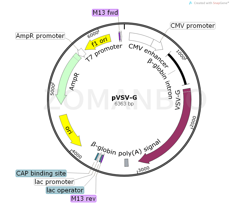 pVSV-G表示G蛋白的水泡性口炎病毒(VSV-G)的控制下CMV立即早期啟動子。VSV-G用于假Moloney Murine Leukenia病毒(MMLV)-介導病毒進入通過逆轉(zhuǎn)錄病毒載體VSV-G與磷脂。靶細胞膜的組成部分,并促進病毒和細胞膜的融合。利用不需要的細胞表面受體,可以作為一個替代病毒包膜蛋白。pVSV-G向量包括靜脈輸液,以提高合成的內(nèi)含子的mRNA的穩(wěn)定性,復制和氨芐青霉素抵抗細菌的Col E1起源(Ampr)基因的傳播和細菌中抗生素的選擇。