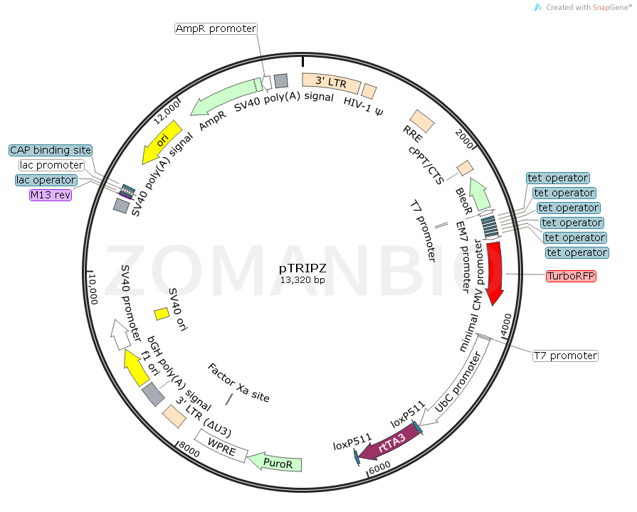 The Thermo Scientific Open Biosystems TRIPZ Lentiviral Inducible shRNAmir Library was developed in collaboration with Dr. Greg Hannon (CSHL) and Dr. Steve Elledge (Harvard). This library combines the design advantages of microRNA-adapted shRNA (shRNAmir) with the pTRIPZ lentiviral inducible vector to create a powerful RNAi trigger capable of producing RNAi in most cell types. The vector is engineered to be Tet-On and produces tightly regulated induction of shRNAmir expression in the presence of doxycycline.