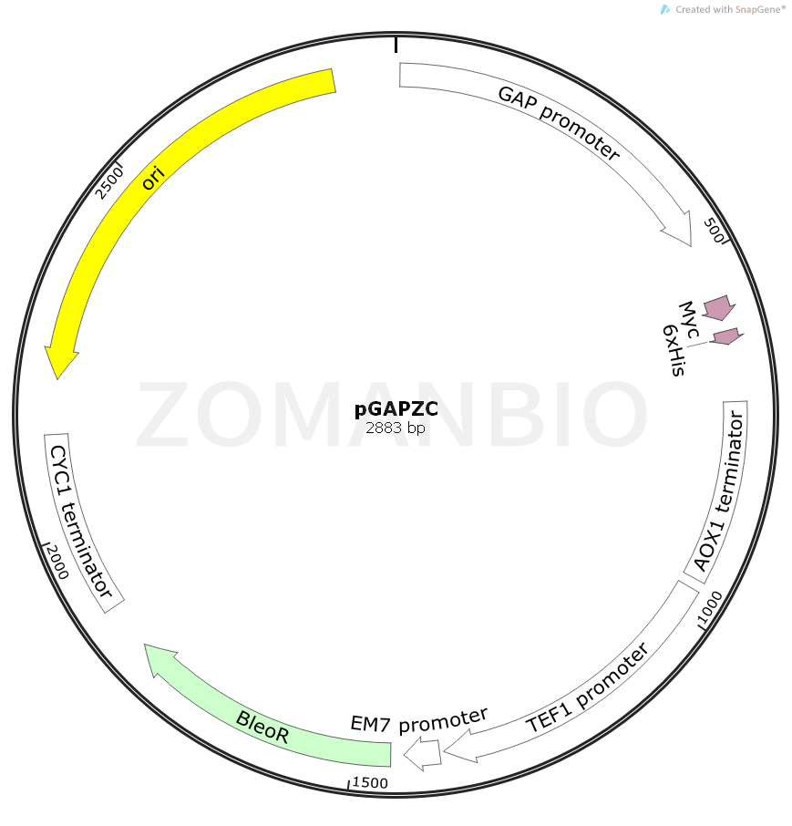 pGAPZ A,B,和C載體(2.9 KB)和pGAPZα,B,和C(3.1 KB)載體使用GAP啟動子在畢赤酵母中穩(wěn)定表達重組蛋白。重組蛋白表達為為帶有C-末端myc抗原表位和C端His標(biāo)簽的融合蛋白。此外,pGAPZα表達的融合蛋白在N-端帶有釀酒酵母(Saccharomyces cerevisiae)的α-因子分泌信號肽。這兩個系列的載體都提供三個不同讀碼框的載體,以方便克隆的帶有C-端標(biāo)簽和/或N-末端分泌信號肽的載體中。這些載體是基于顯性選擇標(biāo)記,Zeocin(博萊霉素)的篩選標(biāo)記可以同時使用于畢赤酵母和大腸桿菌。