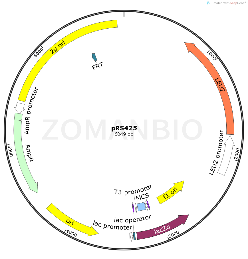 This is a YEtype(episomal) yeast shuttle vector. It encodes the beta galactosidase alpha peptide for bluewhite color detection of inserts and also has the T7 and T3 promoters for in vitro RNA synthesis and priming sites for sequencing. It also contains the REP3 and FRT sequences necessary for high copy propagation in yeast. In S. cerevisiae, the copy number is about 20 per haploid cell. In nonselective growth, plasmids are lost through mitotic segregation at rates in the range of 4.6 +/ 0.6% of progeny per doubling. The order of the major features in this plasmid is: ori(f1) lacZ T7 promoter MCS (KpnISacI) T3 promoter lacI ori(pMB1) ampR ori(2 micron) LEU2.