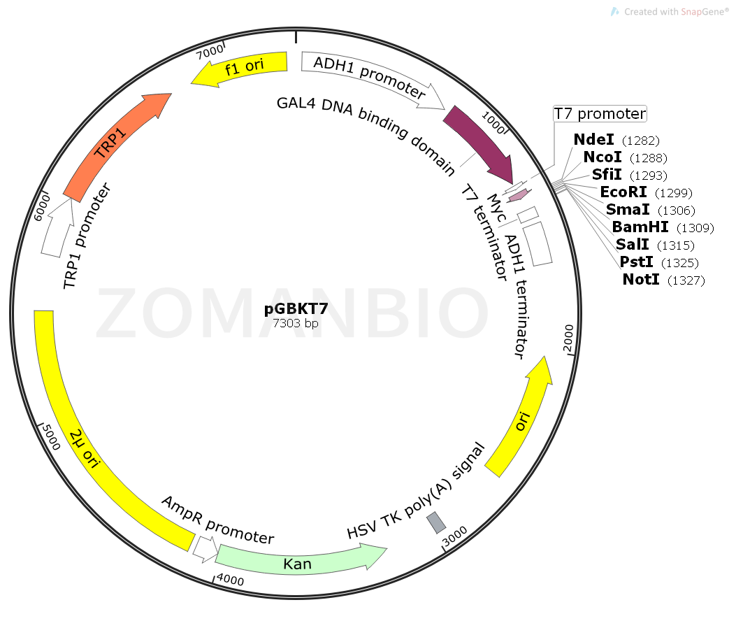 The pEXT03/BD (pGBKT7/BD) vector expresses proteins fused to amino acids 1–147 of the GAL4 DNA binding domain (DNA-BD) for constructing fusion proteins with a bait protein. pGBKT7 replicates autonomously in both E. coli and S.cerevisiae from the pUC and 2 μ ori, respectivel.