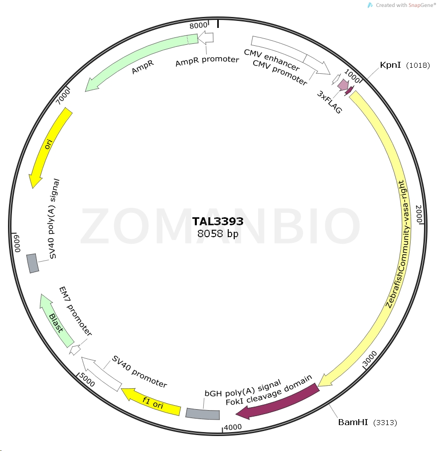 TAL3393質(zhì)粒是一個(gè)表達(dá)斑馬魚(yú)基因的真核表達(dá)質(zhì)粒,CMV promoter啟動(dòng)ZebrafishCommunity-vasa-right基因的表達(dá)。