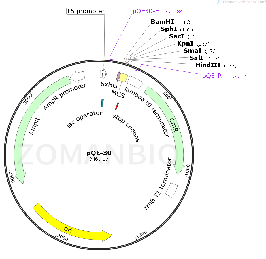 pQE-30質(zhì)粒含有一個強(qiáng)大的噬菌體T5啟動子(被E.coli RNA 聚合酶識別),并含有兩個lac操縱子遏制模塊,用于在E.coli中嚴(yán)謹(jǐn)調(diào)控,高水平表達(dá)融合蛋白。在高水平lac遏制子存在的情況下,蛋白合成被有效阻斷,細(xì)胞毒素載體的穩(wěn)定性增強(qiáng),pQE載體可以在重組蛋白的N端或C端帶上6×His標(biāo)簽。