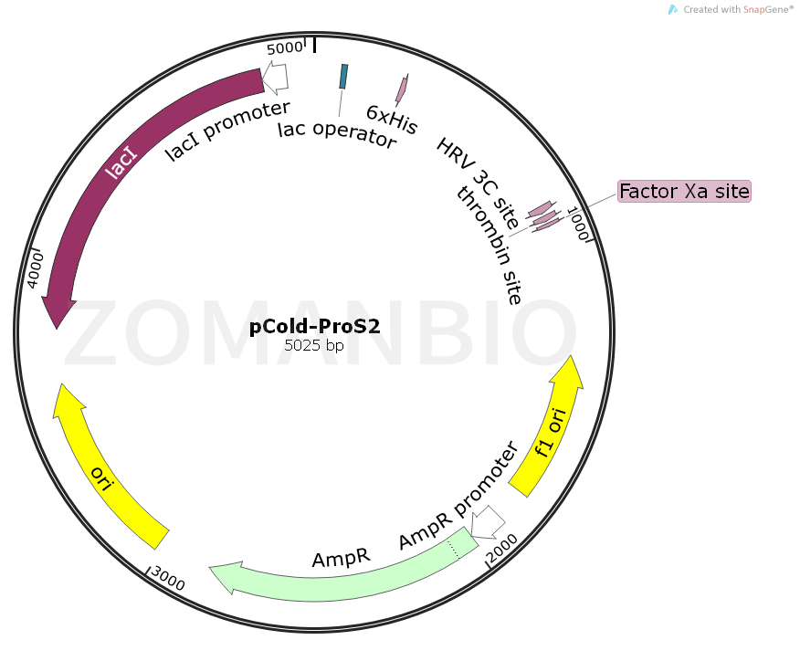 pCold ProS2 DNA 是一種融合的冷休克表達(dá)載體,使用來(lái)源于革蘭氏陰性菌Myxococcus xanthus中的Protein S作為可溶性標(biāo)簽。這種Protein S存在于粘細(xì)菌的孢子衣中,由173個(gè)氨基酸殘基組成,是一種非常穩(wěn)定的可溶性蛋白質(zhì)。將兩個(gè)Protein S的N-末端結(jié)構(gòu)域串聯(lián),再結(jié)合ProS2 Tag的作用,就能使融合目的蛋白的穩(wěn)定性和可溶性得到提高。此外,由于目的蛋白和ProS2-Tag的相互作用性很低,因此可以將二者有效分離。pCold ProS2 DNA Vector在cspA啟動(dòng)子的下游插入了5’非編碼區(qū)(5’-UTR)、翻譯增強(qiáng)元件(TEE)、His-Tag序列、ProS2-Tag和多克隆位點(diǎn)(MCS)。在ProS2-Tag和多克隆位點(diǎn)(MCS)之間主要是HRV3C Protease、Thrombin和Factor Xa的切斷位點(diǎn),用來(lái)消除融合蛋白質(zhì)的標(biāo)簽。此外,在cspA啟動(dòng)子下游還插入了lac operator,可以嚴(yán)格調(diào)控目的基因的表達(dá)。由于本制品的啟動(dòng)子是大腸桿菌來(lái)源的,所以大部分大腸桿菌都可以作為表達(dá)宿主使用。總之,pCold ProS2 DNAVector提供的冷休克技術(shù),能夠促進(jìn)蛋白質(zhì)的正確折疊,增加目的蛋白質(zhì)的可溶性,對(duì)于一些棘手的目的蛋白質(zhì)的表達(dá)是一個(gè)很好的選擇。