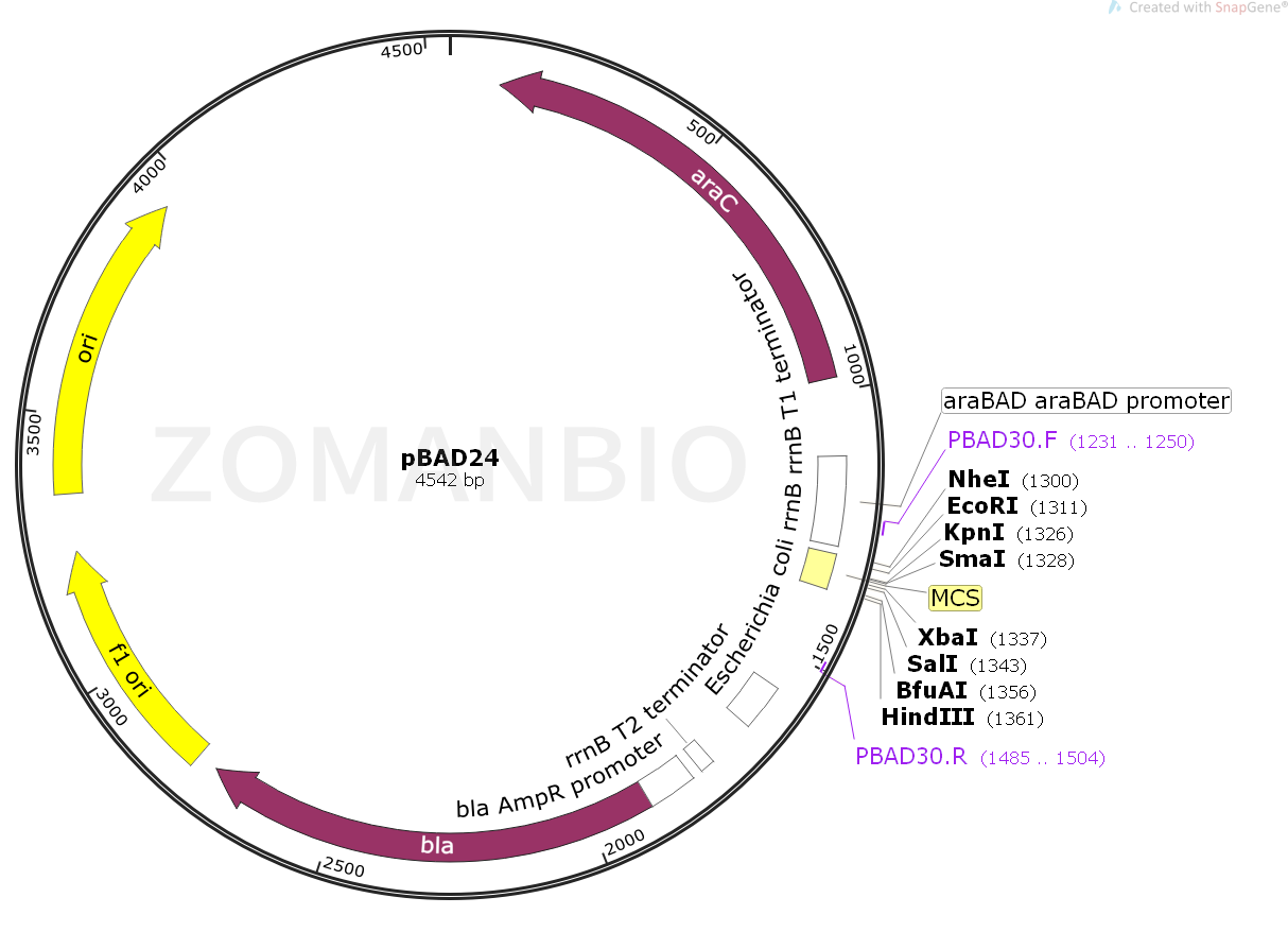 pBAD24質(zhì)粒是衍生于pBR322載體。載體設(shè)計(jì)用來在大腸桿菌中進(jìn)行可調(diào)節(jié),劑量依賴性的表達(dá)和純化重組目的蛋白。使大腸桿菌araBAD啟動(dòng)子(pBAD)增強(qiáng)了大腸桿菌重組蛋白可溶性表達(dá)的水平。pBAD/His和pBAD/Myc-His系列載體上的調(diào)節(jié)蛋白AraC能夠調(diào)控pBad啟動(dòng)子。