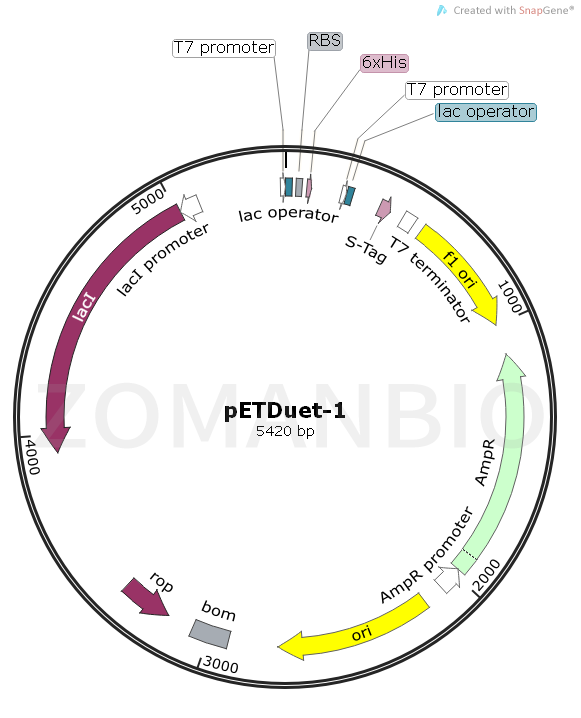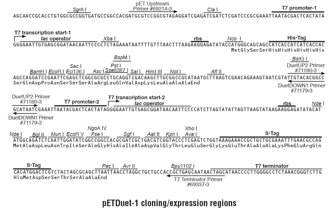 pETDuet-1載體被設(shè)計用來在大腸桿菌中同時表達(dá)兩個外源基因. 載體含有兩個多克隆位點,每一個多克隆位點是通過T7啟動子/Lac操縱子和一個核糖體結(jié)合位點組成。pETDuet-1攜帶有pBR322質(zhì)粒來源的ColE1復(fù)制子, lacI基因和氨芐抗性基因。本載體可以與pACYCDuet-1載體聯(lián)合使用,在合適的宿主菌中,可以一起共表達(dá)至多4個目的基因。插入在pETDuet-1載體多克隆位點1的目的基因可以使用pET Upstream 引物和DuetDOWN1 引物進(jìn)行測序,插入在多克隆位點2的目的基因可以通過DuetUP2 引物 和T7 Terminator 引物進(jìn)行目的基因測序。