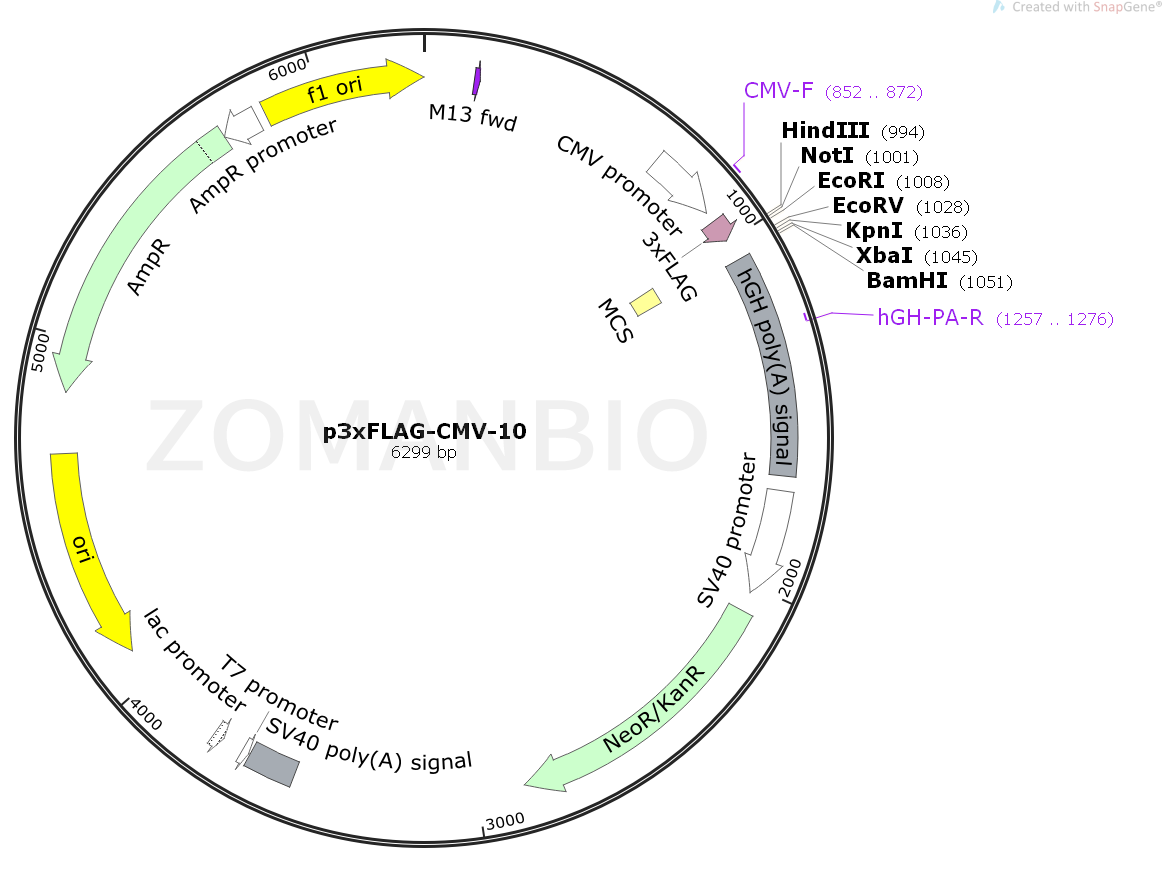 p3×FLAG-CMV-10表達(dá)載體是用于在哺乳動(dòng)物細(xì)胞中建立N-3×FLAG融合蛋白的瞬時(shí)或穩(wěn)定細(xì)胞內(nèi)的pCMV5表達(dá)載體的升級版。該載體在多克隆區(qū)域上游編碼三個(gè)相鄰的FLAG表位(Asp-Tyr-Lys-Xaa-Xaa-Asp)。這導(dǎo)致使用FLAG抗體的檢測靈敏度增加。第三個(gè)FLAG表位包括腸激酶識(shí)別序列,允許從純化的融合蛋白切割3×FLAG肽。