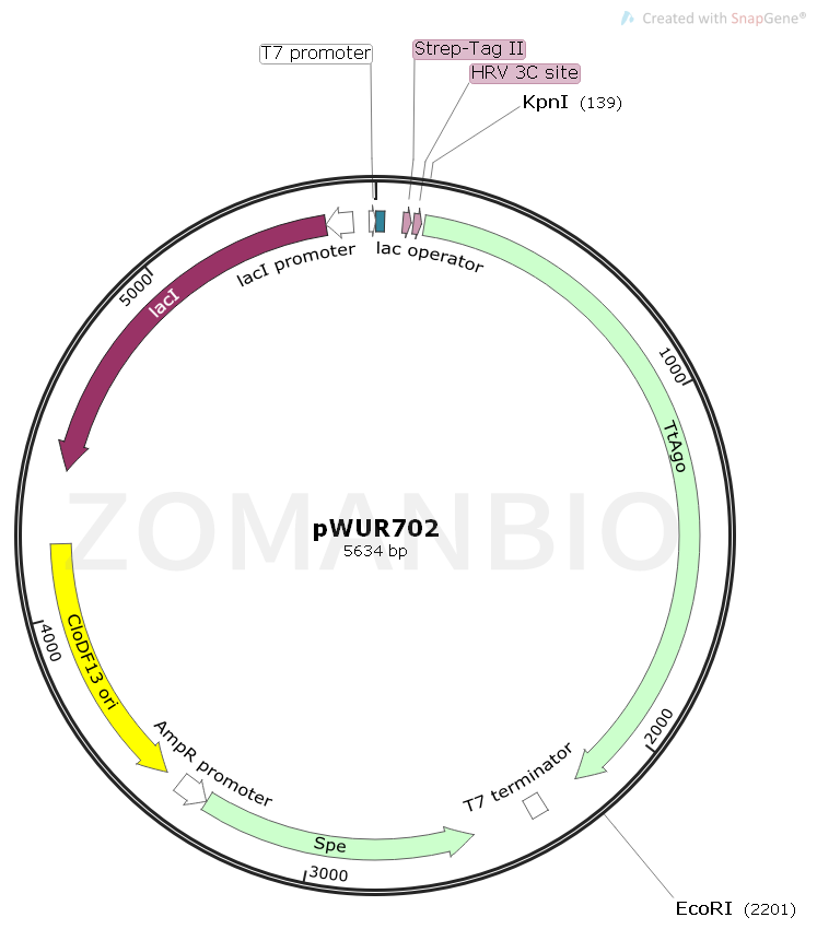 pWUR702質(zhì)??烧T導(dǎo)表達(dá)TtAgo蛋白,在N端攜帶有Strep-Tag II標(biāo)簽和HRV 3C site蛋白酶酶切位點(diǎn)。本質(zhì)粒參考文獻(xiàn)為:DNA-guided DNA interference by a prokaryotic Argonaute.?