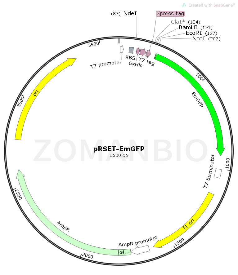 pRSET-EmGFP是一個(gè)大腸桿菌綠色熒光蛋白表達(dá)質(zhì)粒。