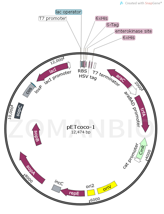 The pETcoco expression vectors are designed to allow “on command” amplification of vector copy number from single copy (1–2 plasmid copies per cell) to medium copy (20– 50 per cell). The vector is maintained in the single copy state by utilizing the oriS and repE elements of the F episome together with the parABC partition determinants. The medium copy state is obtained by employing the RK-2 derived trfA replicator acting at oriV. The switch from single copy to medium copy status is achieved by inducing the expression of the trfA gene with arabinose. The dual replicon nature of these vectors promotes enhanced stability of recombinant plasmids and extremely low basal expression levels in the single copy state, while allowing robust target protein expression typical of the pET vectors. Unique restriction sites are shown on the circle map (below). The sequence is numbered relative to the start of T7 transcription at +1.。